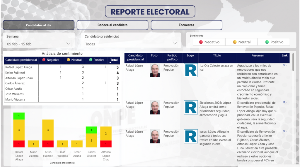 - Análisis de sentimiento: comprende cómo percibe la ciudadanía a cada candidato a través del análisis de redes y medios.